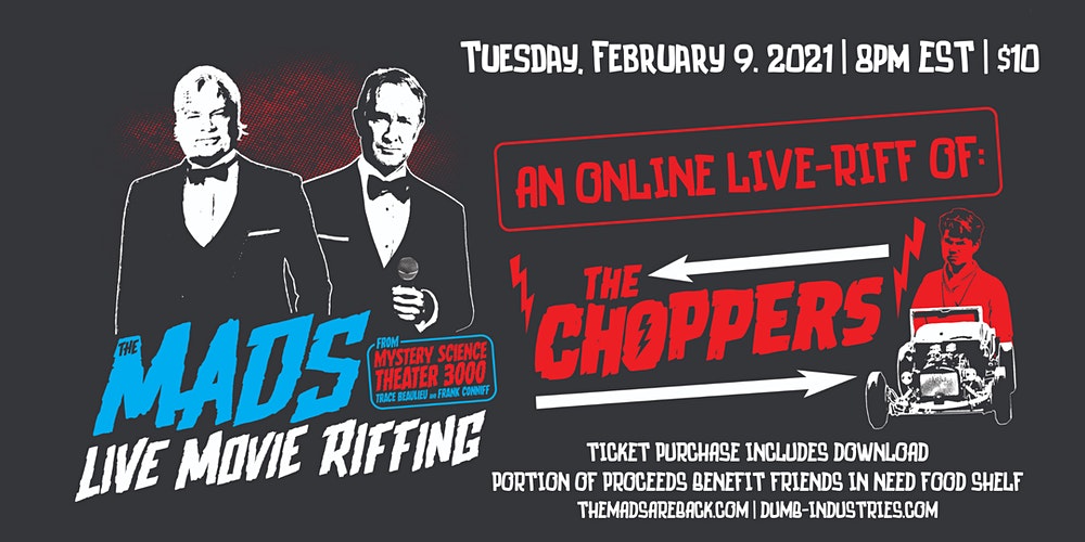 The Mads are back! Join Mystery Science Theater 3000 stars Trace Beaulieu and Frank Conniff (“Dr. Clayton Forrester” and “TV’s Frank”) for this special livestream event as they live-riff on 1961 film The Choppers! A post-show Q&A with Frank & Trace and a very special guest TBA!